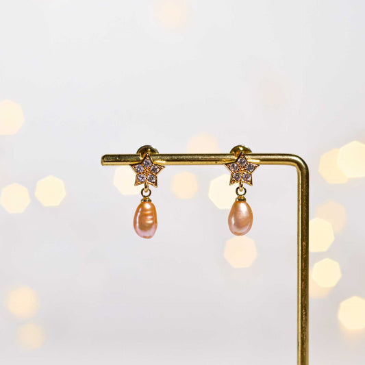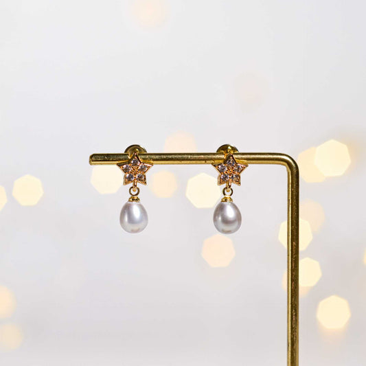 9.0 mm Gray Biwa Pearl Yellow Gold Plated Dangling with 9.2 mm Star Stud with Zircon Earrings
