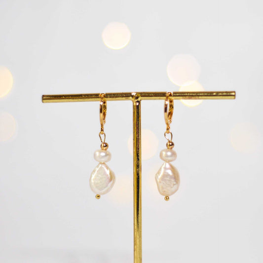 White siopao and baroque dangling pearls yellow gold plated earrings
