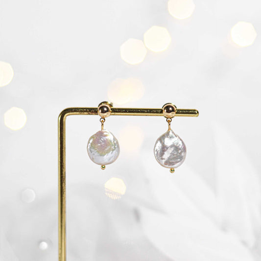 14.7 mm flat coin pearl yellow gold plated ball stud earrings