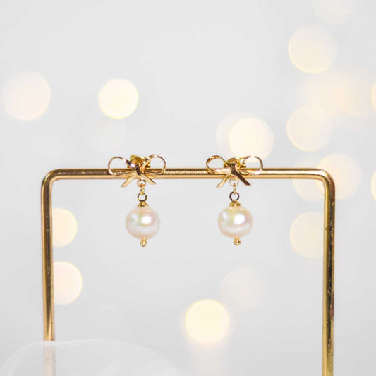 8.5 mm White Kieshe Pearl Yellow Gold Plated with Bow Stud Earrings