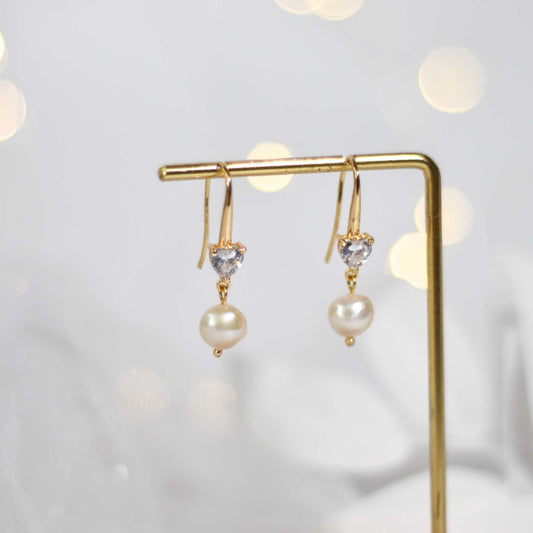 8 mm white kieshe pearl dangling yellow gold plated with 6 mm heart zircon earrings