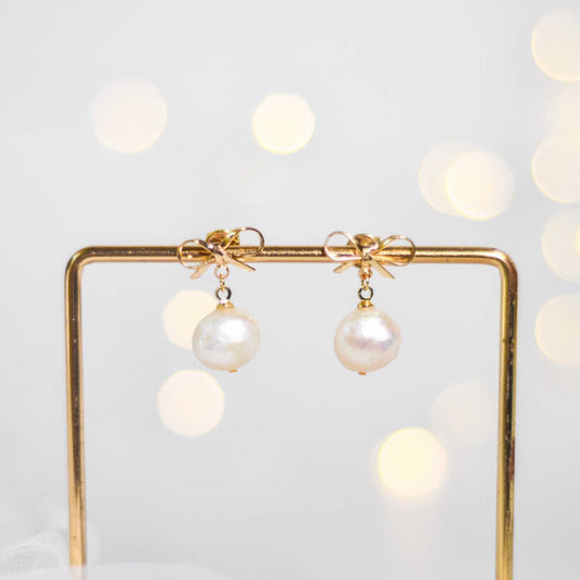 10.8 mm White Kieshe Pearl Yellow Gold Plated with Bow Stud Earrings