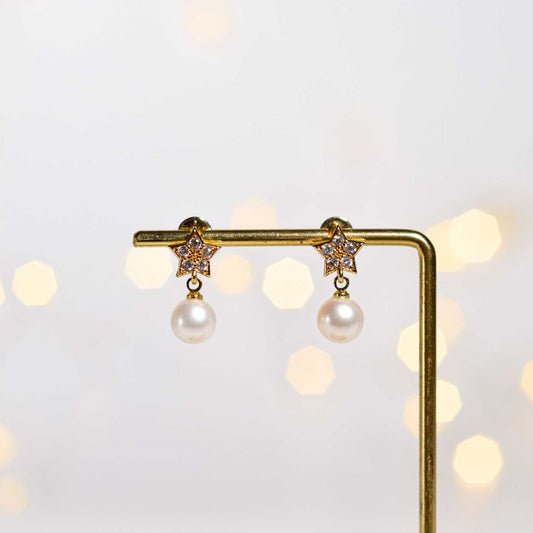 8.3 mm White Round Pearl Yellow Gold Plated Dangling with 9.2 mm Star Stud with Zircon Earrings