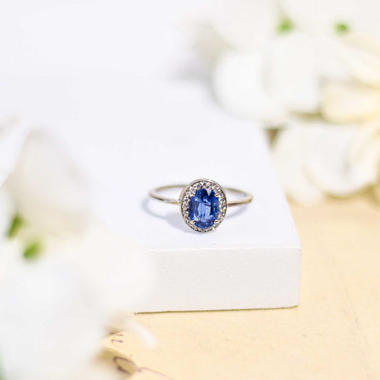 8 x 6 mm Oval cut Kyanite with Cz Halo Rhodium plated Ring