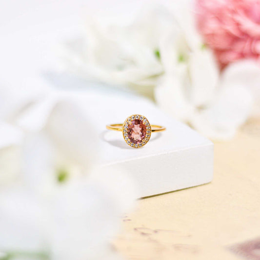 8 x 6 mm Oval cut Pink Tourmaline with Cz Halo Yellow Gold plated Ring