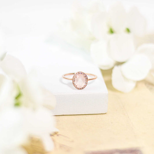 8 x 6 mm Oval cut Rose Quartz with Cz Halo Rose gold plated Ring