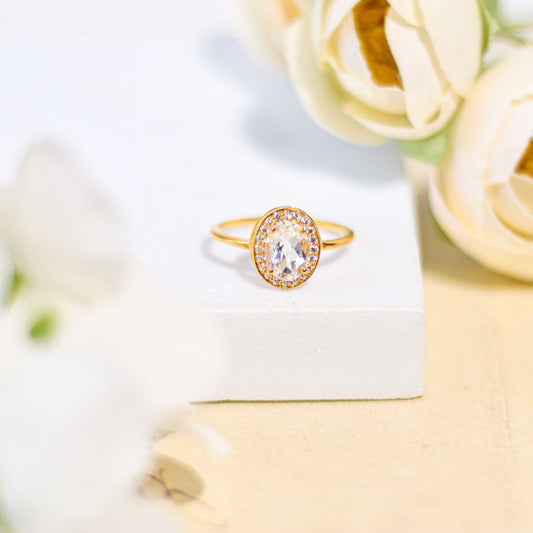 8 x 6 mm Oval cut White Topaz with Cz Halo Yellow gold plated Ring