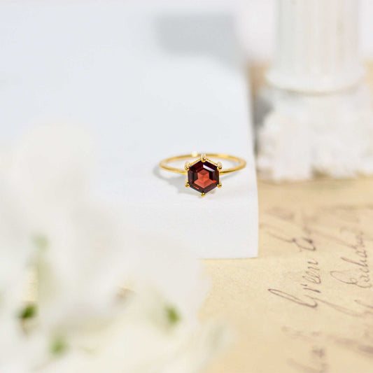 7 mm Hexagon cut Red Garnet Yellow gold plated Ring