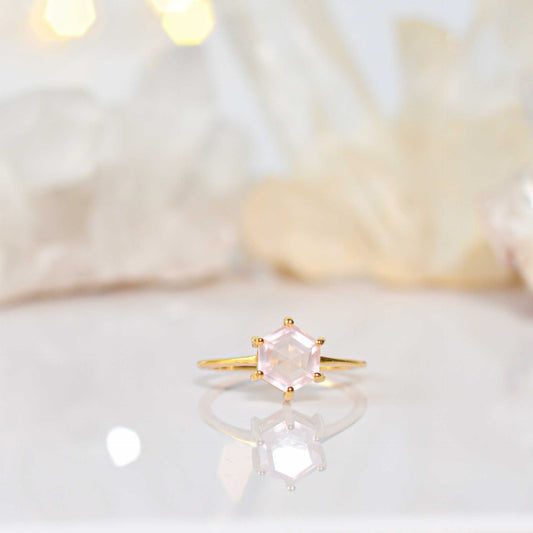 7 mm Hexagon cut Rose Quartz Yellow gold plated Ring