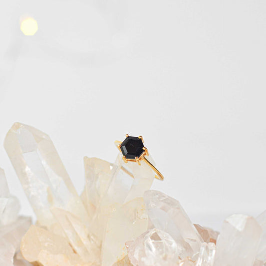 7 mm Hexagon cut Black Onyx Yellow gold plated Ring