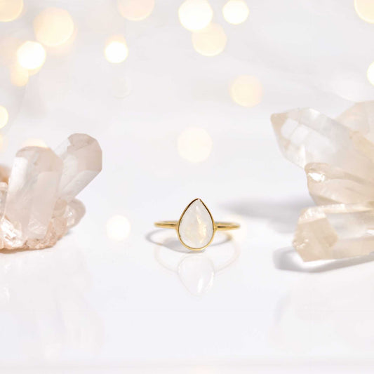 12 x 8 mm Pear cut Rainbow Moonstone Cabochon Ring