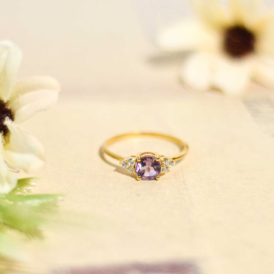 6 mm Round cut Pink Amethyst with 3 Cz side stones Ring
