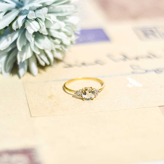 6 mm Round cut White Topaz with 3 Cz side stones Ring