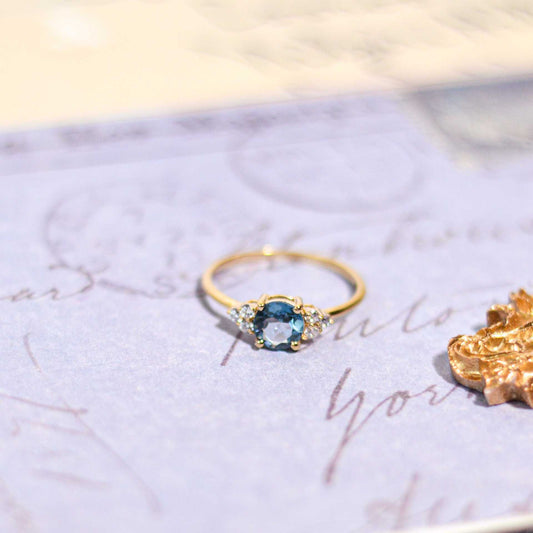 6 mm Round cut London Blue Topaz with 3 Cz side stones Ring