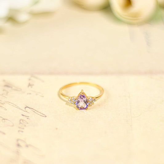 8 x 6 mm Pear cut Pink Amethyst with 3 Cz side stones Ring