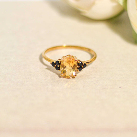 8 x 6 mm Oval cut Citrine with 3 Black Spinel side stones Ring