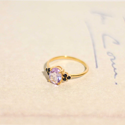 8 x 6 mm Oval cut Pink Amethyst with 3 Black Spinel side stones Ring
