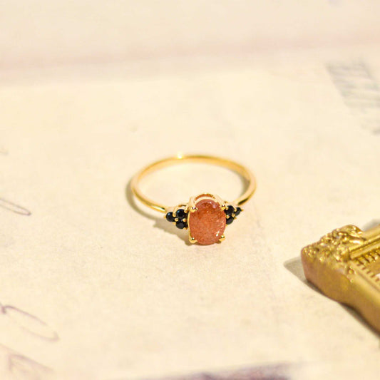 8 x 6 mm Oval cut Sunstone with 3 Black Spinel side stones Ring