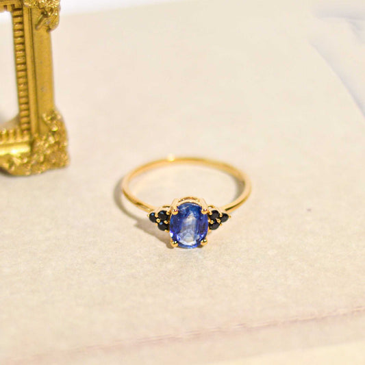 8 x 6 mm Oval cut Kyanite with 3 Black Spinel side stones Ring